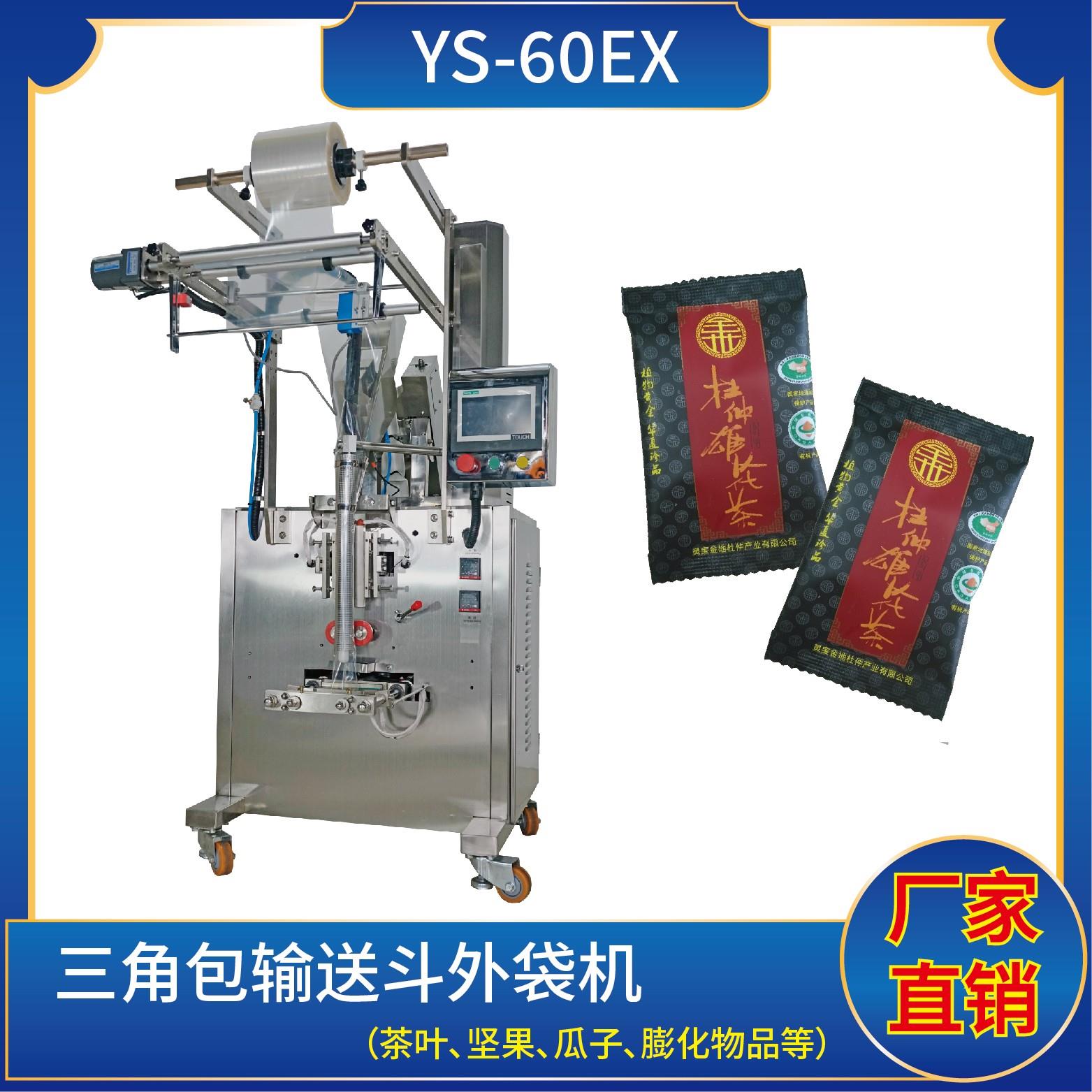 YS-60EX 外袋機特 點 可完成三角包內袋成品輸送至外袋包裝功能。封口方式三邊封/背封 技術參數包裝速度:40 bags/min制袋尺寸:長 ( L ) : 80 - 140 mm 寬 ( W ) : 60 - 120 mm外型尺寸:790 * 1950 * 1800 mm 整機重量:300 kg總 功 率:AC220V / 50Hz / 2.5kw氣 源:≥0.6m3/ min